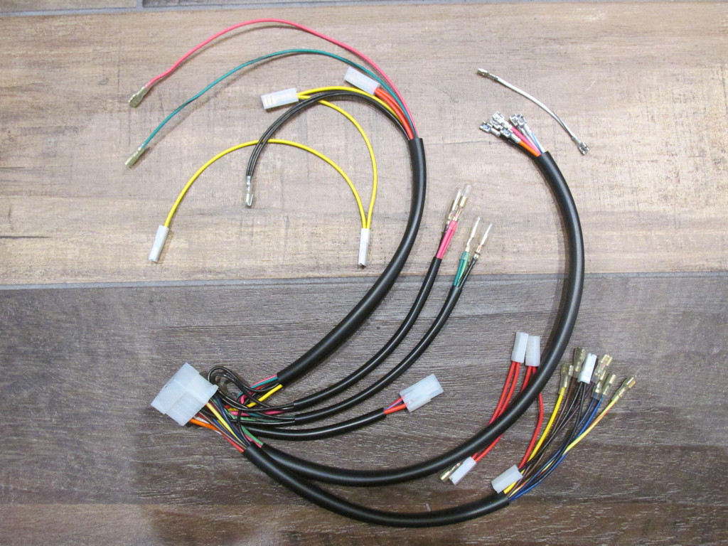 Main harness for the Le Mans 1000 (Series 1) Series 1 machines were produced from about 1983 through about 1987. I duplicated an original main harness. In construction, I use the same gauge of wire, the same colors and tracers (stripes), the same length and sheathing, the same terminals, etc. All terminals are of the double crimp, strain relief variety.
